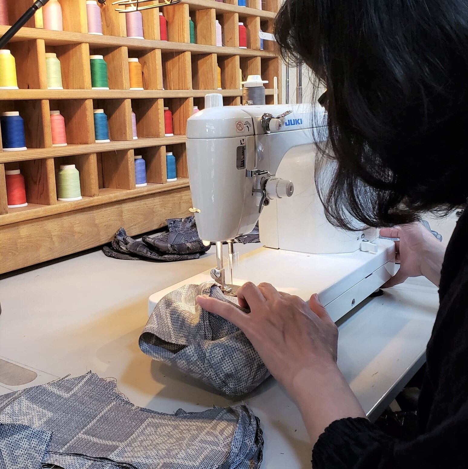 正絹の着物を解き、洗濯、天日干し後、アイロン蒸気加熱処理をした生地を、一点一点手作業にて縫製を行いました。